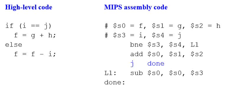 if문의 조건이 아니면 else문을 실행해야 하기 때문에 mips에서 bne(조건이 다르면) L1으로 분기하라는 것이 있으며 마만약 조건이 같으면 분기 하지 않고 add를 수행한다. 이후 else문은 수행을 하면 안되므로 j를 사용해 done으로 무조건 분기한다.