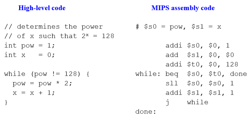 while문에서 pow가 128이 아닐동안 수행하는 것이기 때문에 128이 되면 while문을 돌면 안된다. 따라서 mips에서 while문이 beq인 이유가 pow가 128이면 돌지 않고 분기해야하기 때문이다. 또한 while문의 마지막에 j가 있는 이유는 계속해서 돌아야하기 때문에 while로 다시 분기를 하는 것이다.