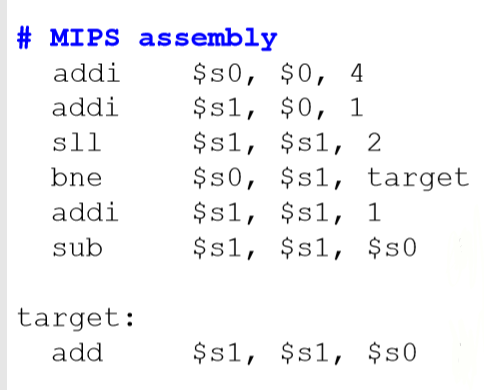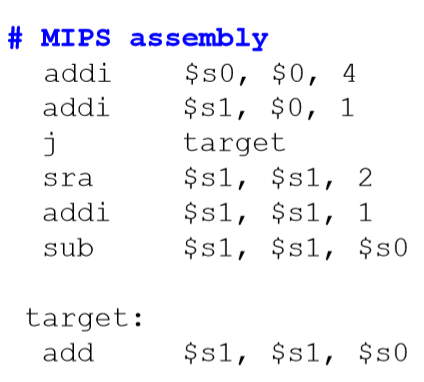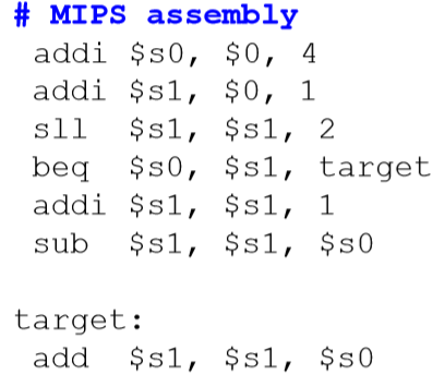 이후 나오는 beq에서는 $s0과 $s1이 같으면 target으로 가라는 명령어다. 현재 $s0과 $s1은 4로 같기 때문에 target으로 바로 분기한다. 따라서 beq후에 나오는 addi와 sub명령어는 수행하지 않는다.