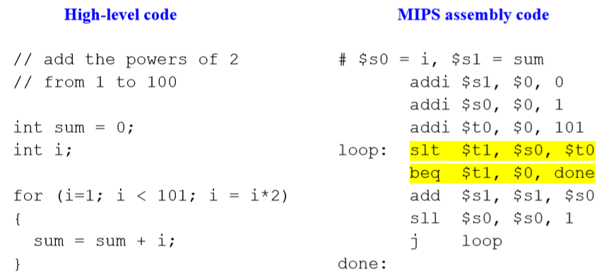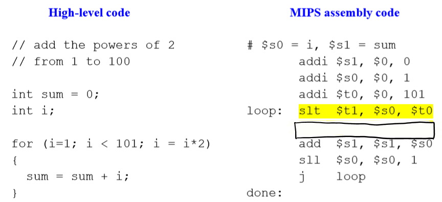 slt에서 i가 101보다 크거나 같으면 0을 넣기 때문에 beq를 사용해서 $t1이 0이면 분기하도록 하면 된다.