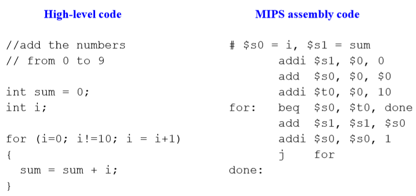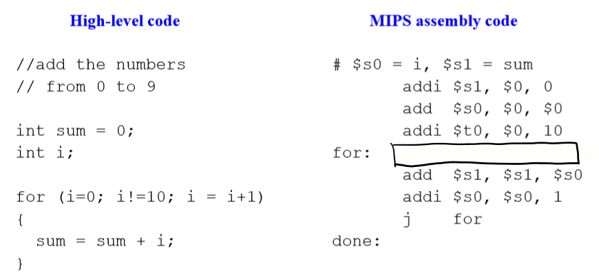 for문에서 i가 10이 아닐 동안 돌아야하기 때문에 i가 10이 되면 돌지 않아야 한다. 따라서 mips에서 i가 10일 경우 분기하도록 beq $s0, $t0, done이 되어 있다. 또한 계속 돌기위해 for문 마지막에 다시 for문으로 분기하는 j 명령어가 있다.