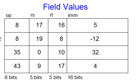 addi $s0, $s1, 5에서 $s0은 rt로, $s1은 rs로 상수 5는 imm값으로 들어간다. 또한 더하는 명령어의 op코드 값인 8이 op자리에 들어간다.