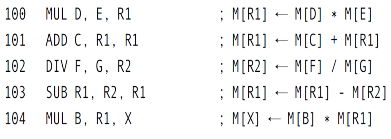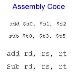a = b + c 는 밉스 어셈블리 코드로 add a, b, c 로 나타낼 수 있다. 여기서 add는 연산코드이며, a는 목적지, b와 c는 각각 소스1, 2이다. 밉스 어셈블리 코드에서는 무조건 destination코드 위치가 정해져있음을 주의한다.