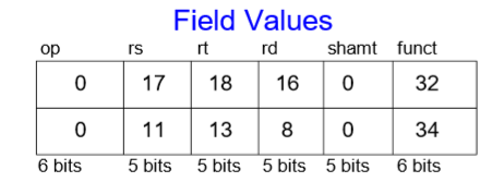 이렇게 된다. R-Type이기 때문에 op코드가 0, rs와 rt는 source, rd는 destination이다. 여기서는 곱셈과 나눗셈이 없으므로 둘 다 0이고 funct는 add는 32, sub은 34로 나타낸다.