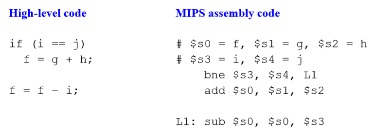 if문의 조건은 i와 j가 같으면인데 mips에서는 bne 즉 i와 j가 같지 않으면을 쓴다.