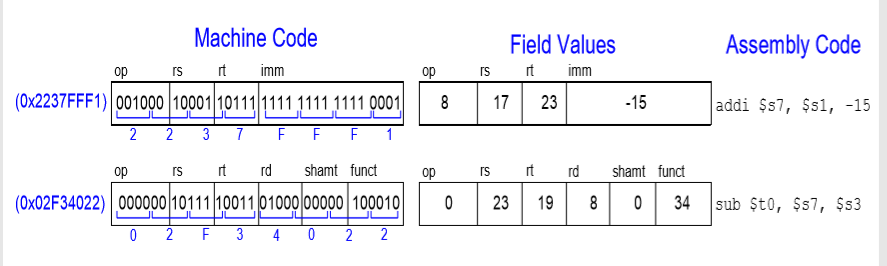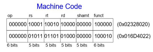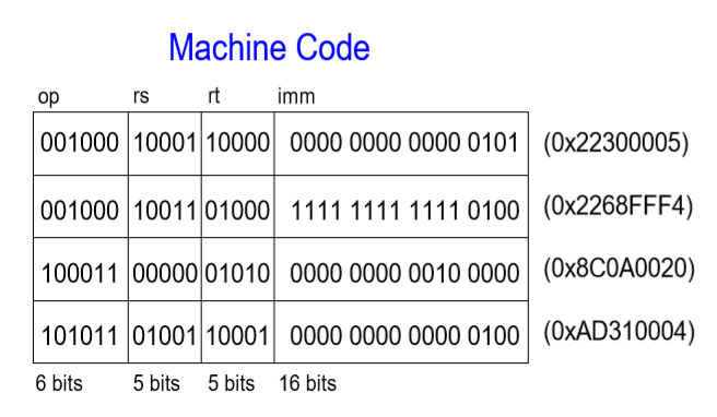 기계어는 32비트 명령어로, 명령어들을 이진 표현한다. 즉 0과 1로만 나타낸다.