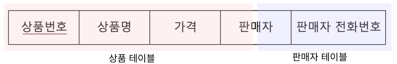 상품번호가 기본키라고 했을 때 상품번호는 상품명, 가격, 판매자, 판매자 전화번호를 결정한다.