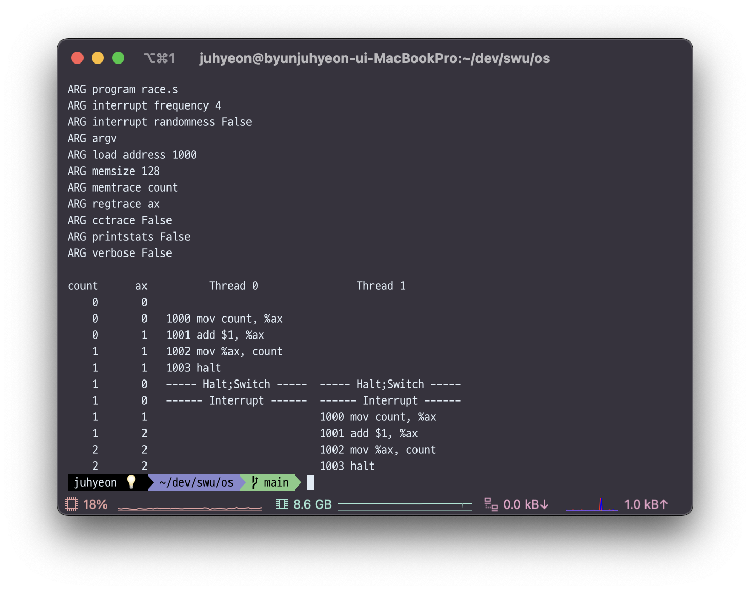 race.s와 test-and-set.s은 count 변수의 값을 1 증가시키는 어셈블리 instruction 코드이다.