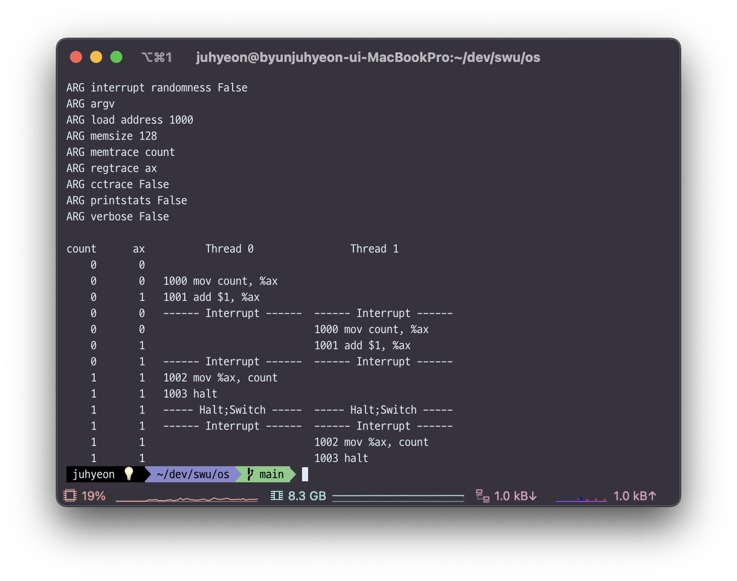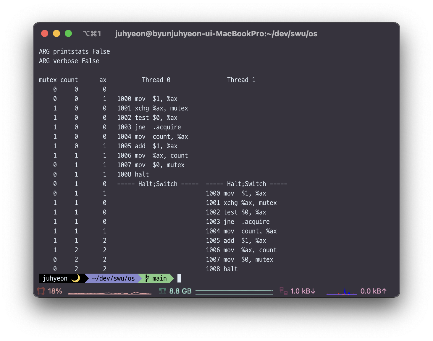 Thread1은 인터럽트를 걸고 ax값을 1로 셋팅해서 현재의 mutex값과 비교한다. Thread0이 count값을 가져오고(1004) ax에 1을 더하고(1005), ax를 count에 저장하는(1006) critical section에 해당하는 코드를 실행하기 직전에 mutex값을 1로 셋팅하기 때문에 Thread1은 mutex값을 보고 1이면 Thread0이 아직 critical section코드를 수행하고 있다고 알 수 있기 때문에 다시 1000번 명령어로 점프하게 된다.