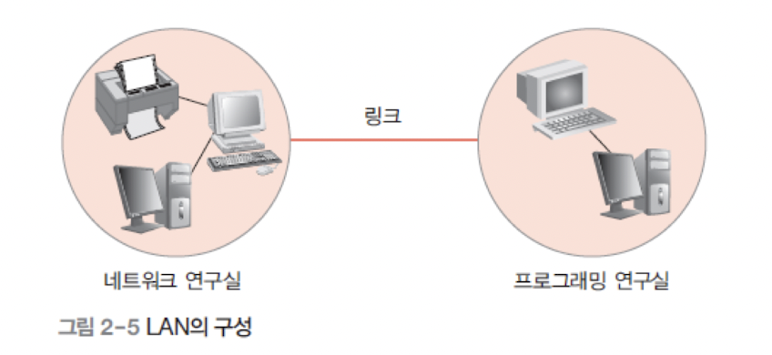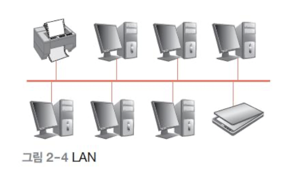 - 한 건물 또는 인접한 건물군 내에 있는 네트워크는 하나의 LAN으로 간주되며 집이나 빌딩 안에 있는 사무실 등 지리적으로 제한된 곳에서 컴퓨터와 프린터, 스캐너 등을 연결할 수 있는 네트워크이다.