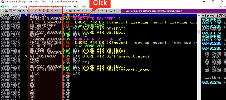 1부터 100까지의 합 코드를 작성하기 전에 Immunity Debugger에서 코드 패치를 이용하여 새로운 코드를 작성하는 방법을 다루려고 한다.