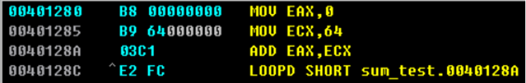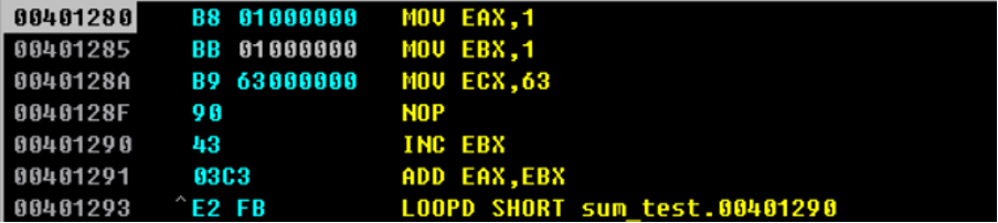 ECX가 0이 되면 LOOP를 멈춘다. 99번 돌았기 때문에 이 시점에서 EBX값을 보면 1에서 99를 더한 64(10진수로 100)이다.