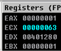- LOOP는 EBX가 100일 때까지 더하려면 2~100까지 즉 99번 돌아야 하므로 ECX값을 99로 정해 줘야함. 99를 16진수로 하면 63이기 때문에 63으로 초기화 시킨다.