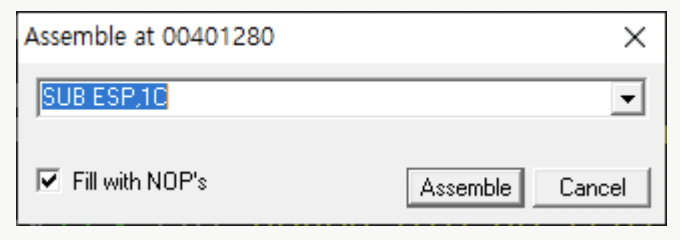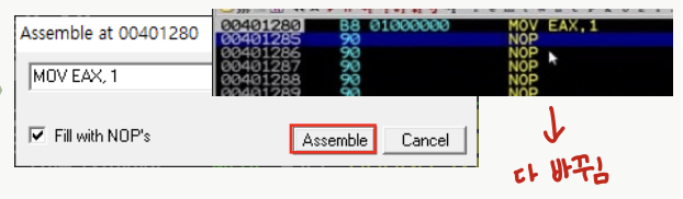왼쪽 처럼 뜰 텐데, 여기서 코드를 수정하고 Assemble을 누르면 해당 줄의 코드가 변경되고 밑에는 NOP으로 모두 변경된다.